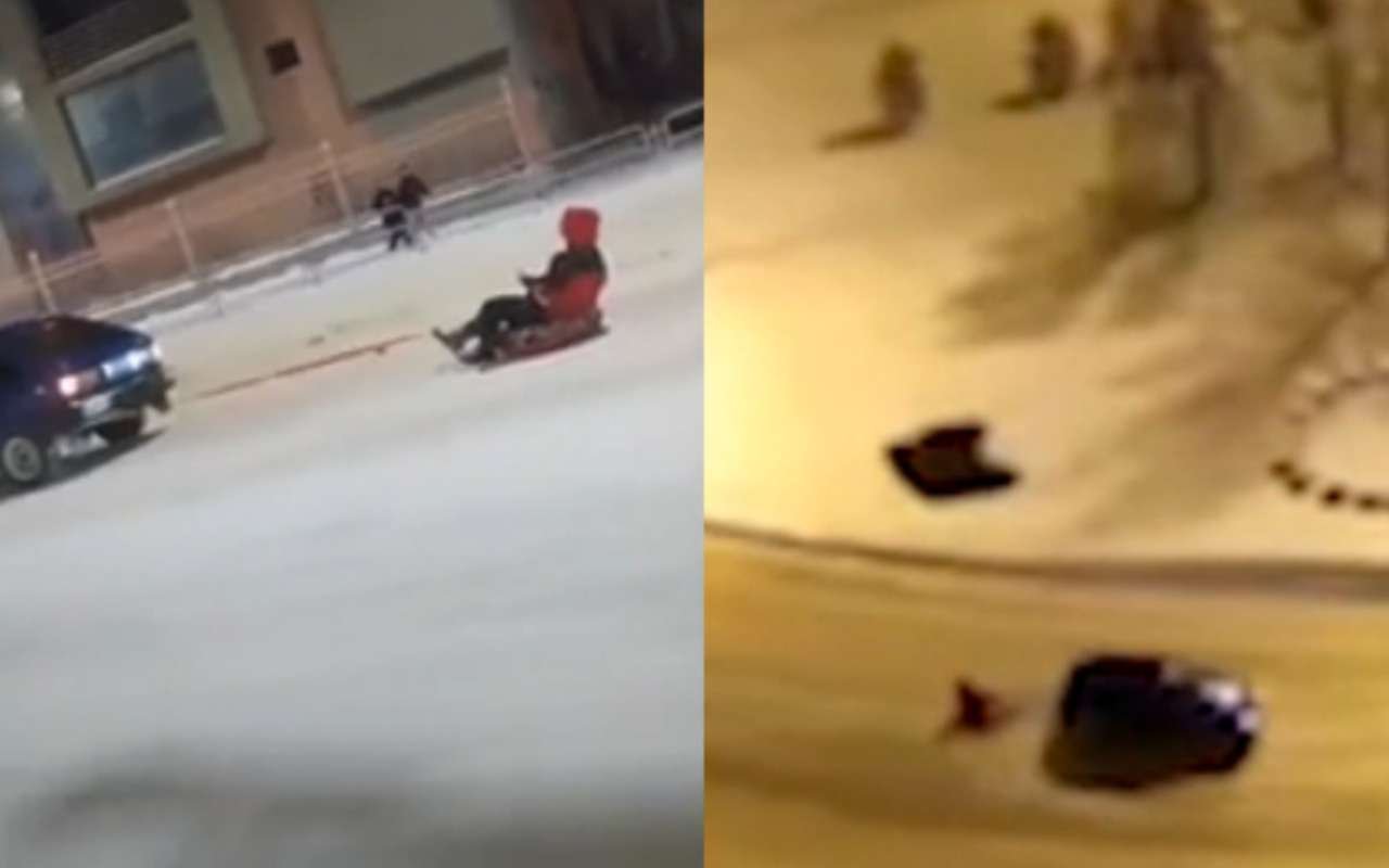 Водитель привязал «ватрушку» к автомобилю ИЖ и покатался по оживленным улицам заснеженного города.