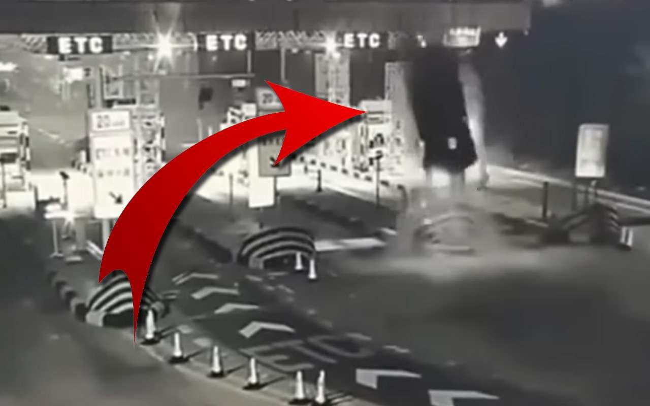 Произошло это в Китае — автомобиль врезался в перегородку между пунктами взимания платы, машина взлетела в воздух, а затем рухнула на землю.