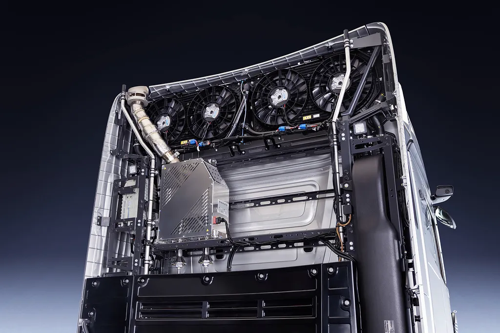 З нововведень відзначимо і кабіну ProCabin від моделі eActros 600, яка порівняно із стандартною має зменшений на 9% коефіцієнт аеродинамічного опору. Від «600-го» також перейшла цифрова панель приладів Multmedia Cockpit Interactive 2. Тягач отримав передові системи допомоги водію, які вже застосовуються на серійних моделях: Active Brake Assist 6, Front Guard Assist і Active Sideguard Assist 2.
