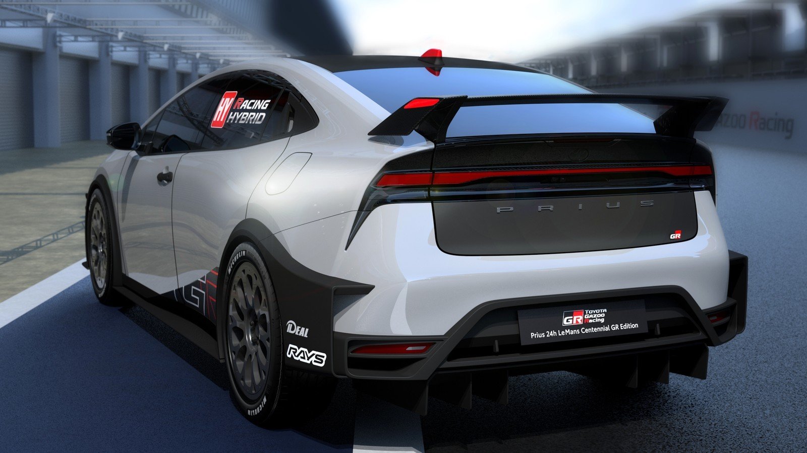 Гибридный Prius в таком триумфальном контексте выглядит вполне органично, тем более что команда TGR снабдила его эффектными трековым обесом: новый передний бампер в мощными «четырёхлгазыми» фарами для ночных гонок, массивный передний спойлер и боковые канарды; углепластиковые капот, пороги, расширители колёсных арок и антикрыло на корме; новый задний бампер с развитым диффузором. Вдобавок расширена колея и уменьшен дорожный просвет. Специально разработанные для концепта аэродинамические колёса обуты в спортивные шины Michelin Pilot Sport 4S.