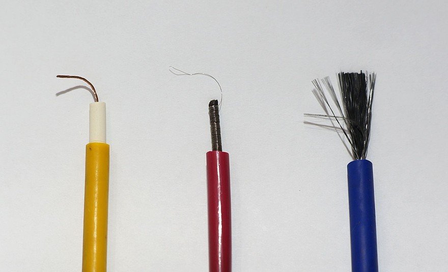 Для наглядности измерим омметром короткие тестовые куски проводов длиной несколько сантиметров. Желтый – реально нулевой: те тысячные доли Ома, что в нем имеются, бытовой мультиметр засечь не в состоянии. Красный – 123 Ома, ну а «карбоновый» синий – аж почти 3,6 килоома.