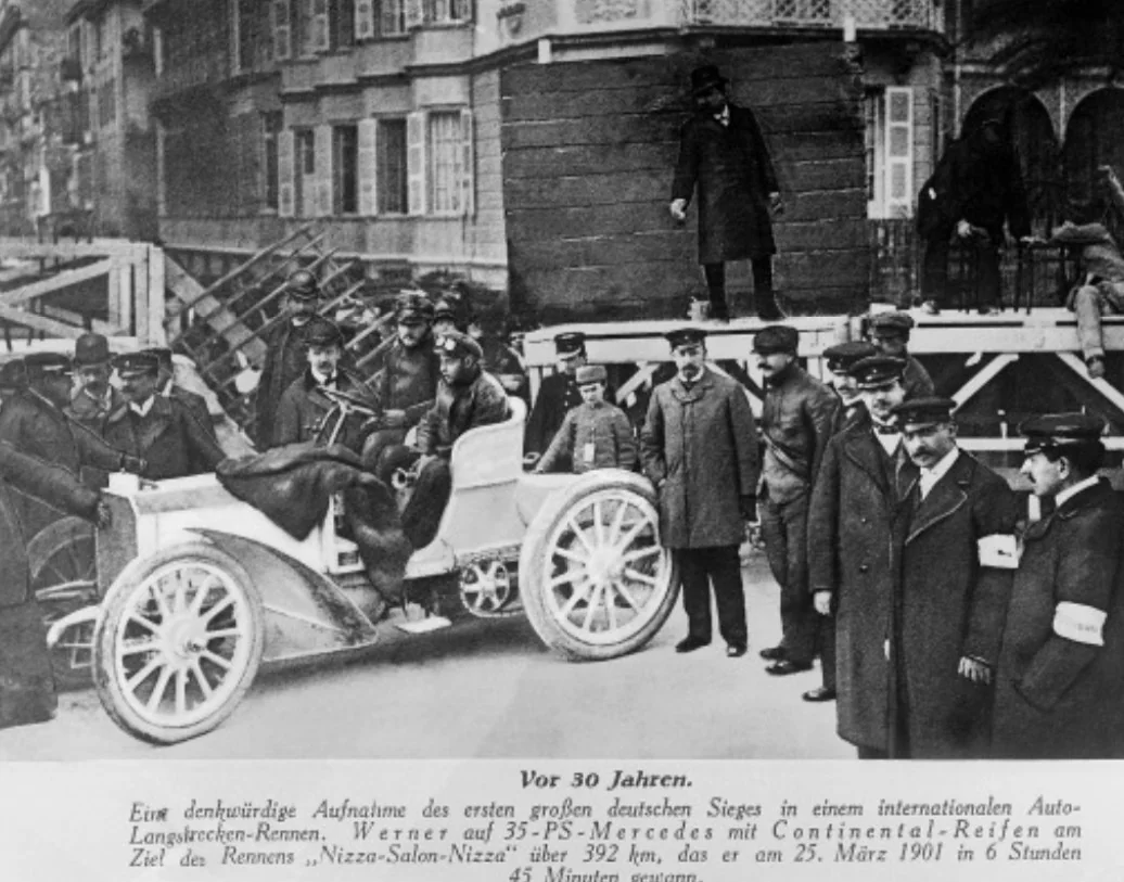 Автомобіль Mercedes 35 hp, заявлений бароном де Ротшильдом, на фініші гонки “Ніцца-Салон-Ніцца” 25 березня 1901 року. Вільгельм Вернер виграв гонку на дистанції 392 кілометри – з результатом 6 годин 45 хвилин.