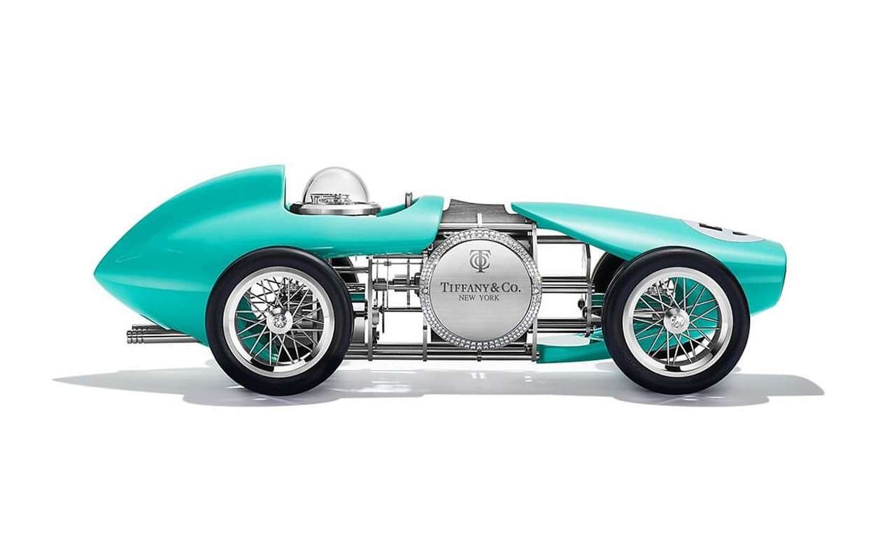 Вдохновленные гоночными автомобилями 1950-х годов ювелиры изготовили часы из алюминия и покрасили фирменной краской Tiffany Blue. В машинке установлены износостойкие резиновые шины со спицами и ободами из полированной нержавеющей стали.