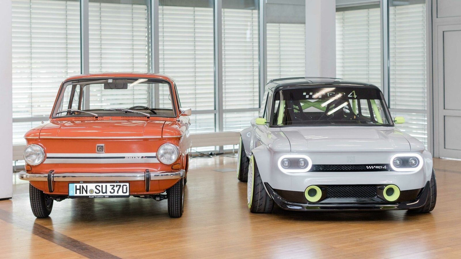 Электромод NSU Prinz EP4 разработали 12 молодых стажёров Audi вместе с преподавателями, за его основу был взят NSU Prinz 4, выпущенный в 1971 году. Машина давно была не на ходу и изрядно подгнила, но команда Audi восстановила и усилила кузов, причём его внешность стилизовали под спортивный NSU Prinz 1000 с овальными фарами. Для повышения жёсткости в кузов врезана часть панели пола от хэтчбека Audi A1 и трубчатый каркас безопасности, тормоза и элементы шасси также позаимствованы у Audi A1, из-за чего сильно увеличилась колея — она потребовала больших расширителей колёсных арок. Облик рестомода разработан при поддержке штатных стилистов Audi, он тщательно проработан, чем сильно и в лучшую сторону отличается, например, от ежегодных студенческих проектов Skoda.