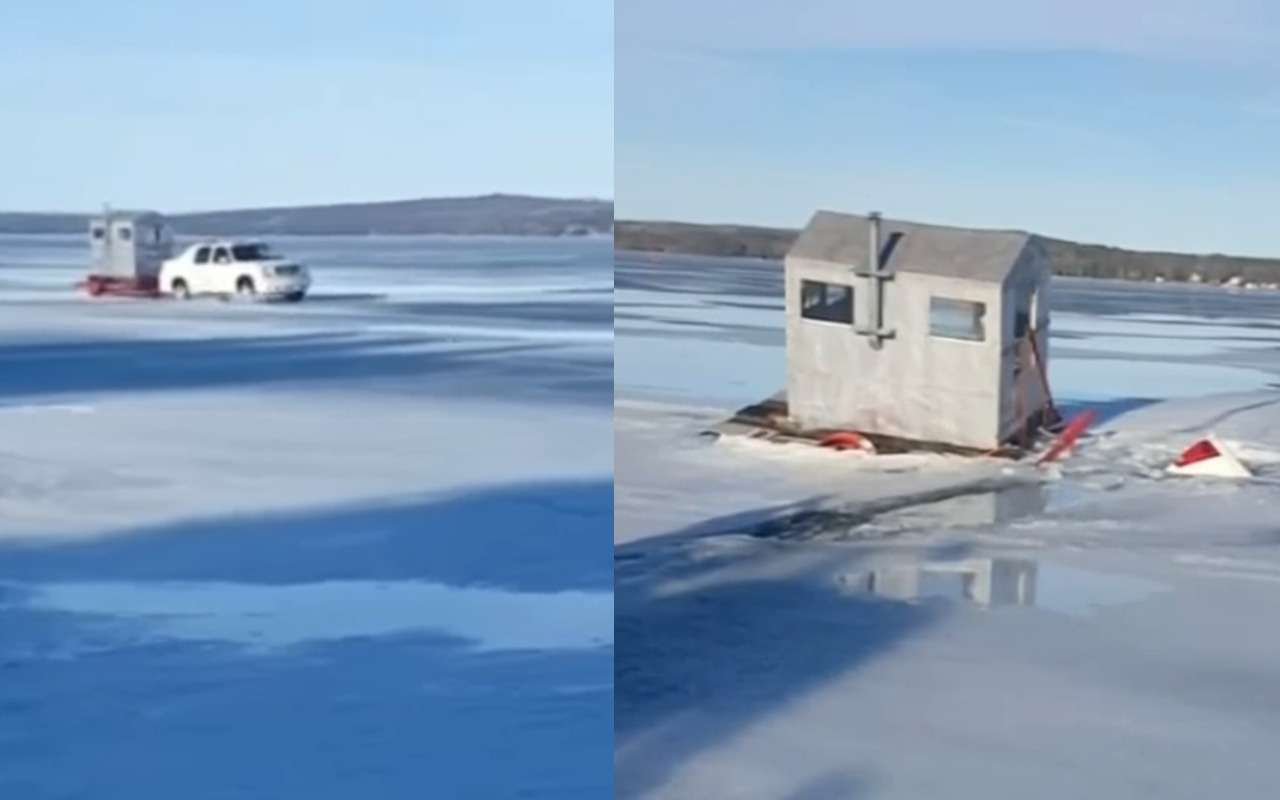 В Америке на озере Мичиган мужчина на Cadillac Escalade вез домик для зимней рыбалки в новое место. Как это обычно бывает, внезапно лед расступился.